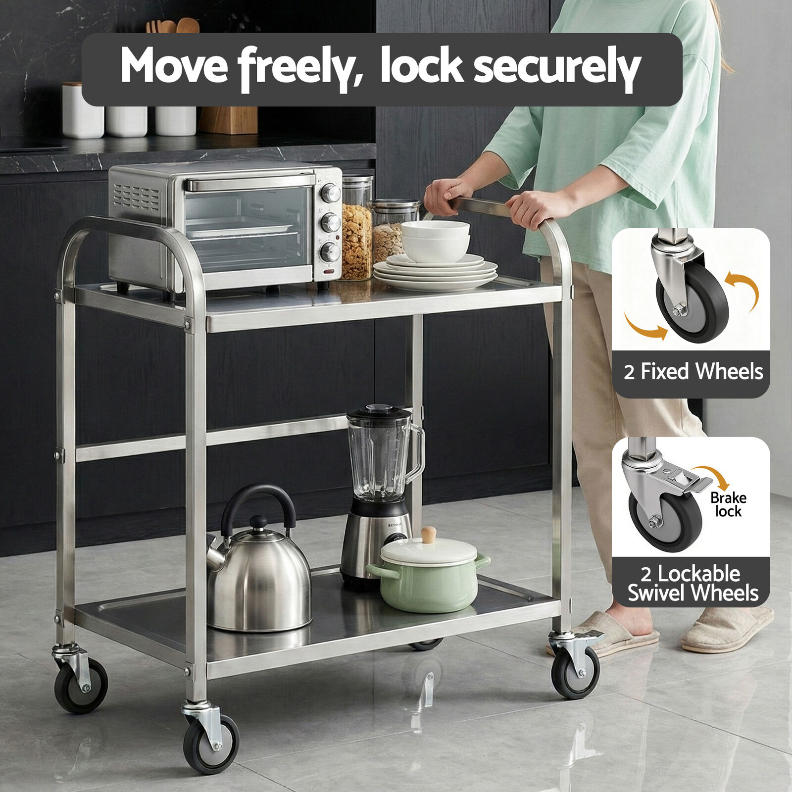 Need extra bench space that moves with you? This stainless steel kitchen trolley is your solution! Built with 201 stainless steel, it offers durable and cost-effective performance for everyday kitchen use. The 2-tier design provides flexible storage and workspace, while lockable castors let you wheel it anywhere and secure it in place.