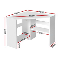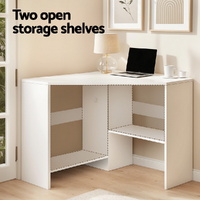 Maximize your space without compromising on style with the Wall Corner Computer Desk. This innovative L-shaped desk is expertly designed to fit snugly into any corner, making it the perfect compact workstation for home offices, studios, dorm rooms, or bedrooms.Crafted from durable MDF in a clean white finish, this desk offers a surprising amount of functionality. It features: convenient open storage shelves for your books and essentials, a dedicated CPU stand to keep your tower off the floor, and a practical cable management hole to maintain a tidy and clutter-free workspace. The robust design includes stable legs to ensure a solid and shake-free surface for work or study.Ideal for creating a productive environment in even the smallest of rooms, this desk is both fashionable and immensely practical. With clear instructions and straightforward assembly, transforming your unused corner into a functional command center has never been easier. Features: Compact wall corner desk, suitable for corners in different directions