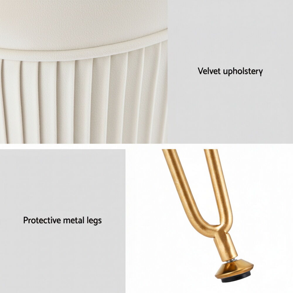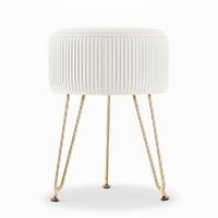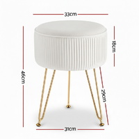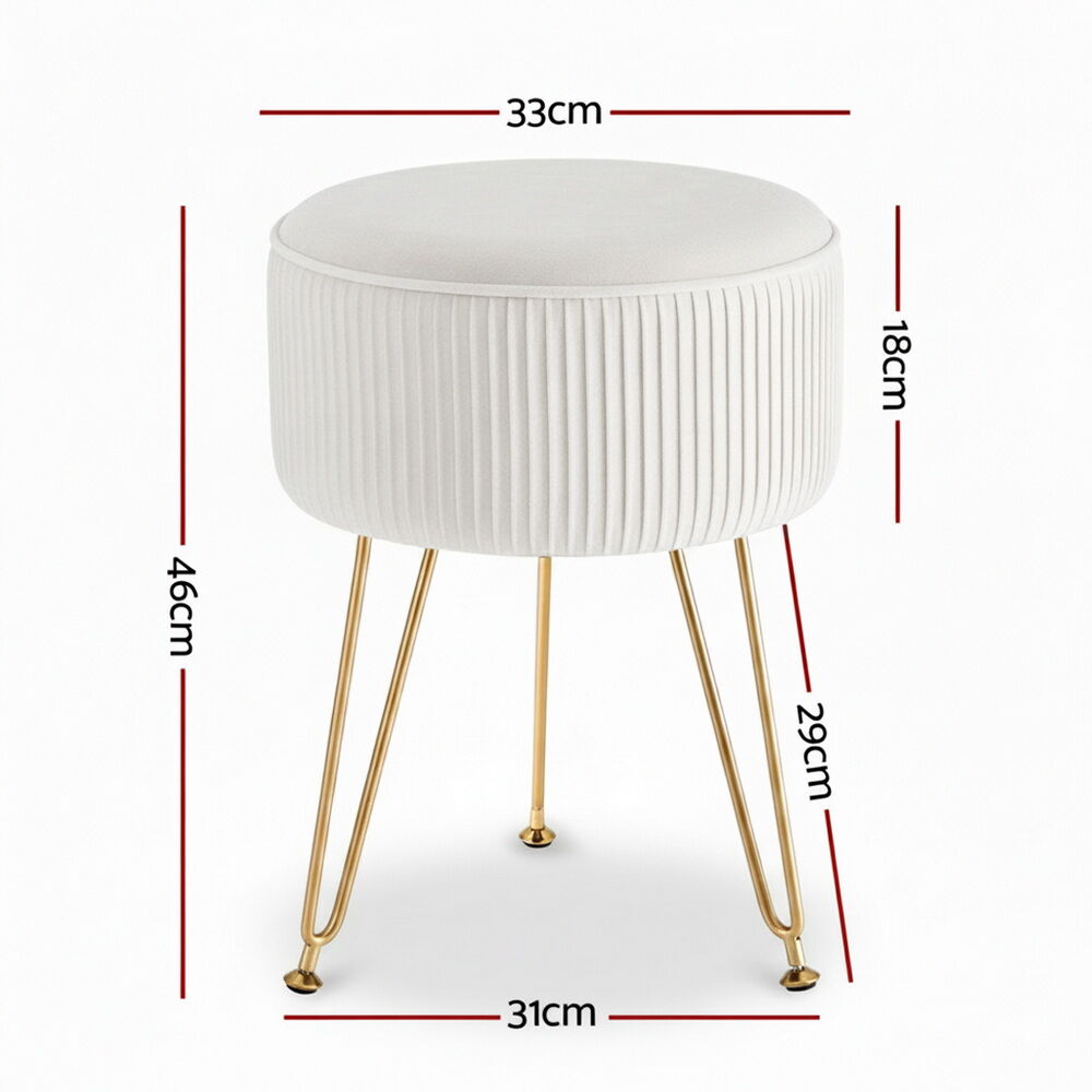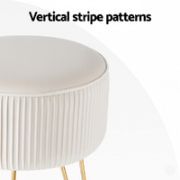 Round velvet footstool with vertical stripe design, featuring high-resilience foam for comfort and a sturdy gold metal base for stability. Elegant and versatile, it serves as a footrest, extra seat, or stylish decor piece. The soft velvet upholstery adds a touch of luxury to any room, while the compact size fits perfectly in living areas or bedrooms. No assembly required.